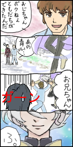 うきゃああ!! ありがとうあありがとう、流石へそうち様、ええ、きっと描いて下さると思っておりましたよ!素敵素敵。しかも某閉め切り前に...!うう、これで私の心も少しは癒されるというものです。 そしてライバルの「青いお兄ちゃん」に心のオアシス、サムを奪われそうな予感の「赤のおじちゃん」哀れ。ただでさえ、おでこの辺りがヤバいのに。未だ30代前後なのに。ええ、アンチエイジングに余念のないホントはおじちゃんの11倍くらい歳食ってる「青いお兄ちゃん」には到底適いません事よ。 次ネタもかなり楽しみです。