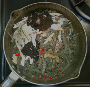 苦参とか甘草とか木香だか牡丹皮(?)だとか、キノコっぽいの(猪苓?)とかに混じって、