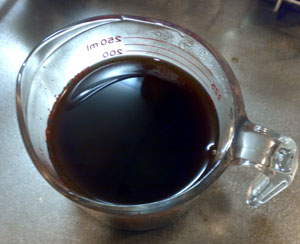 煎じるとまあこんなんで。濁ったコーヒーみたいな色。ニオイは乾燥時も煎じた後も、ワタシ漢方です〜ってニオイで。