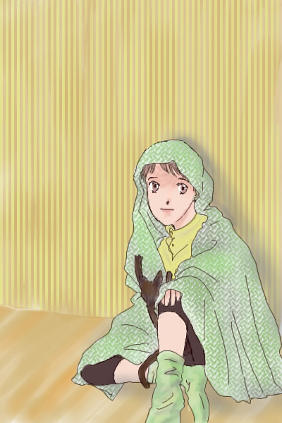 にゃんこがひっついてるvv靴下の緩み具合がツボです♪ 座ってる姿、難しいのにバランスいいですね。 マント風にかかったブランケット質感も暖かそうですv 空いたとこに文字入りそうでインテリアの広告みたいでステキですよv お絵描き、お気楽でいいのですよ〜^^