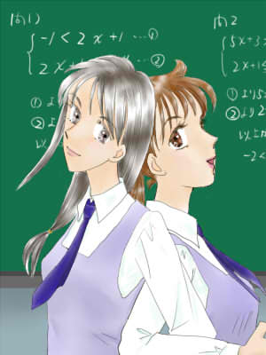 さわやかな女の子ペア、思わず笑顔になっちゃいますv黒板の数式には、うわっと・・><(数学苦手で受験も数学のコマの少ない高校にした思ひ出が;因数分解までが理解の限界・・)。